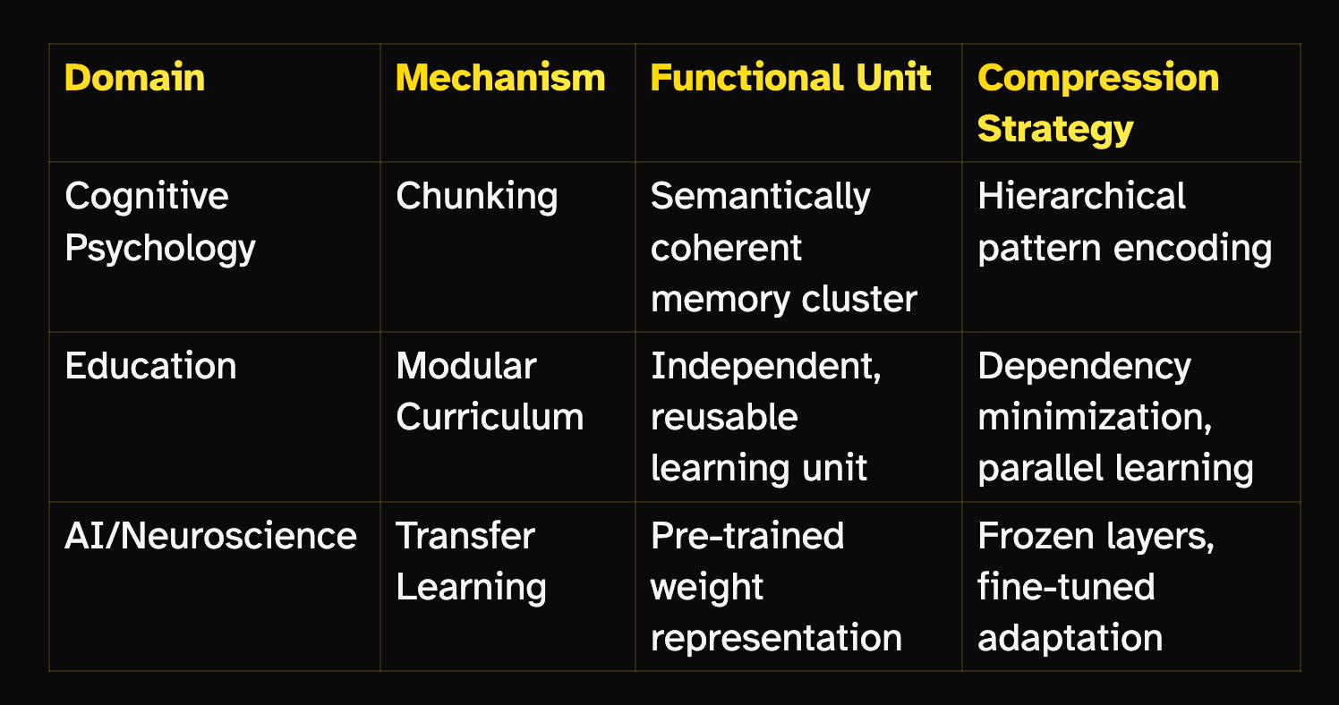 This article argues that three seemingly disparate mechanisms — chunking in cognitive psychology, modular curriculum design in education, and transfer learning in artificial intelligence — are structural isomorphisms of a single foundational principle: functional information compression and reuse. By tracing the mechanistic lineage of how biological and artificial systems optimize learning efficiency, we demonstrate that expertise in any domain emerges from the progressive construction of high-density, reusable representational units. The convergence of these mechanisms across cognitive science, pedagogy, and computational neuroscience reveals a universal architecture for accelerated learning: systems that compress raw information into transferable modules outperform those that process data atomistically. We conclude by proposing a unified predictive framework where the brain, curriculum, and neural network are instantiations of the same algorithmic solution to the combinatorial explosion problem inherent in open-ended learning.